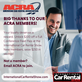 Planning is well underway for the 2024 International Car Rental Show in Las Vegas from April 15 – 17, 2024 at the Horseshoe Las Vegas. Please note the change in the standard days of the 2024 show – it will run from Monday through Wednesday (rather than Sunday through Tuesday). ACRA members again will receive a special discount registration rate for the 2024 ICRS – a discount that for many is more than your 2024 ACRA membership dues! So – don’t delay! When you receive your 2024 ACRA membership dues invoice from Sharon, process it quickly to take advantage of the 2024 ICRS registration discount. See you in Las Vegas in April 2024!
